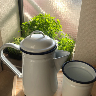 これ、ホーローっていうのでしょうか?蓋がなくなった水差しと、蓋付きの容器の二点です。蓋は、ちょっとユルユルですが、水差しにも使えます。