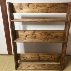 本棚として自分で作りましたが、テーブルの脇に置いて紅茶缶を設置したりいろいろ工夫して使っていました。素人作品です。ブラインワックスを塗って板をネジで固定しているだけのものです。