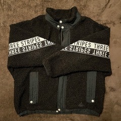 アディダスのロゴテープをあしらった、ふわふわした質感のアディダスのボアジャケット。