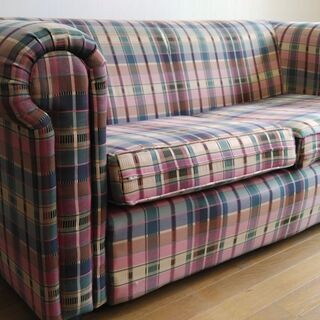 1000円 2人掛け 2P ソファ チェック柄 破れ補修済み 【引き取り限定】