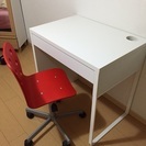 パソコンや勉強机用のテーブルとローラーがついた赤い椅子がセットです。