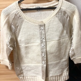 5分袖、クリーム色のカーディガンです。あまり着ていなく綺麗だと思います。ニット部分にアルパカ混のウールで綿の部分はシルク混なので品良くテカリがあります。