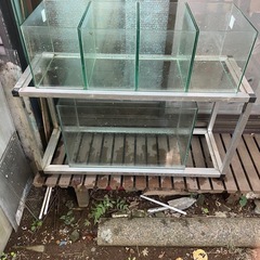 ずっと倉庫に保管してました。背面に画像の様にライト吊り下げパイプ取り付け済みです。水槽ライトクーラーは付属しません、台 水槽のみの販売です。