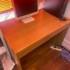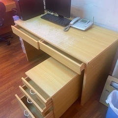 ごらんの木製デスクです。天板にハゲ塗装のハゲが見られますが、特に使用には問題ございません。袖机がついてとても便利になっています。当方事務所は階段で2階から下ろす必要がございます。お手伝いはいたします。机の上にございます。パソコン等は商品ではございません。