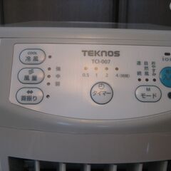 メーカーはテクノス製でタイプはTCI-007の形式です。定価は11000円位しました。機能は風量が強、中、弱で連続、自然風、おやすみの3段階のモードが有ります。首振り角度は80度で上段、下段の風の角度調整レバーが有ります。タイマー機能で0.5時間から7.5時間有ります。給水タンクは3.8L有り保冷剤を入れて冷やし涼しい風を送ることが出来2個保冷剤が付いています。除菌効果として消臭除菌としてマイナスイオンを300万こ以上発生いたします。リモコンも付いているので遠隔操作もできます。取りに来てくれる方お願い致します。非常に暑い時期が長く続きますので是非どうですか、宜しくお願い致します。