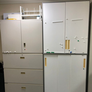 事務所移転につき、取りに来て頂ける方のみ差し上げます。傷はそれなりにありますが、使用には問題ありません。中の天板もしっかりついています。高いほうのキャビネットは鍵もついています。2021年2/8までに取りに来て頂けると助かります。当方さいたま市中央区大戸一丁目です。他にパソコンデスク3台、デスクキャビネット4台、椅子3脚ございます。