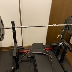 ベンチプレスのセーフティーつきラックとバーとプレートのセット110kgになります。