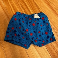 青色に赤と紺の星柄のベビー水着、ショートパンツスタイルで快適な着用感。