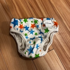 ネイビー地に赤と白の星柄のベビー水着、ウエストゴムで着脱簡単。