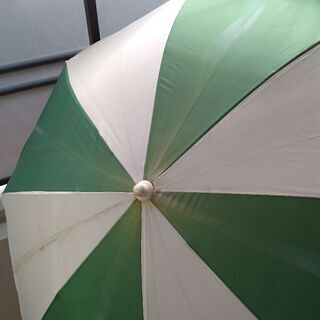 古いビーチパラソルです。季節ものだけに、使用回数は多くないですが、色あせや黄ばみ、錆などはあります。雨のかからない屋外で保管していたものです。