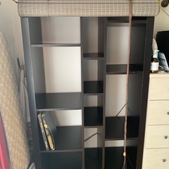 ダークブラウン(ほぼ黒)色の大きな棚。幅89×高さ150×奥行38.5。このオファーでは、グレー/ブルーの竹のカーテンをプレゼントします。サイドにはコート掛け/バッグ掛けも付いていますが、取り外しもできると思います。棚には多少の傷がありますが、ほとんど目立ちません。まだ状態は良いと思います。より簡単に再組み立てできるよう、お客様ご自身で解体していただきますようお願いいたします。ネジや釘は使用していません(ダボのみ)。棚は重いので、車まで運ぶときは2人でお願いします(私は阪急スクエアのすぐ近くの高野地区のエレベーターのない5階に住んでいます)。