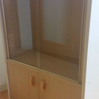長年使用したので使用感、汚れともあり。ガラスの扉2枚、棚板2枚あり。サイズはおよそ、幅54㎝奥行き30㎝高さ80㎝。棚板2枚は写真では外してあります。