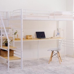 Simpolu ハイタイプ ロフトベッド 机付き シングル ハイベッド 手すり付き スチール ベッドフレーム はしご付き ベッド下収納 階段 パイプベッド 収納付き 一人暮らし 多機能 大人用 耐震 頑丈 高さ170.5cm (タイプ B、ホワイト)