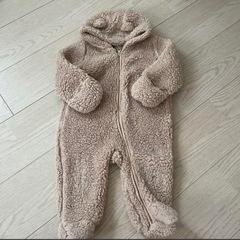 クマ耳が可愛いモコモコアウターです。色味的に男女どちらでもいけます◎中は裏起毛じゃないので着せやすく重宝しました。手と足がすっぽり隠れますよ。汚れなどは見当たらないのですが、足部分は使用感ございます。