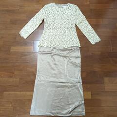 アイボリーの花柄トップスとベージュロングスカートのワンピース。