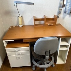 写真に売っている学習机と椅子、収納チェスト、ライト付きです。