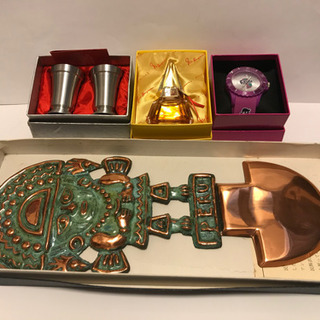 ピューターのカップ2個、香水、腕時計、銅製の壁飾り、以上4点です。