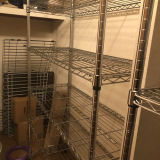 10年以上使っていたメタルラックです。同じもの2台セットです。写真1, 2は使用時のもの、写真3,4は分解後のもの写真5は留め具セットです。現在は分解した状態です。取説はありませんが簡単に組み立てられると思います。部品はもちろん全部揃ってます。
