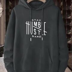 メンズカジュアルスポーツフーディー「Stay Humble, Stay Hard」プリント入り - ポリエステルニット生地、長袖、フード付き、レギュラーフィット、わずかなストレッチ、幾何学模様のアップリケパターン - ヒップホップスタイルのオーバーサイズファッションスウェットシャツ