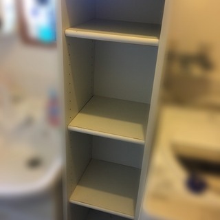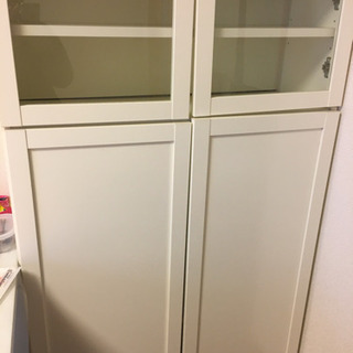 IKEAの棚です。上部の透明な扉が付いている部分は自分たちでカスタムして付けたものです。5年ほど使用しましたので全体的に歪み、背中部分の板の若干のズレもございます。ただしまだ使用できる状態です。