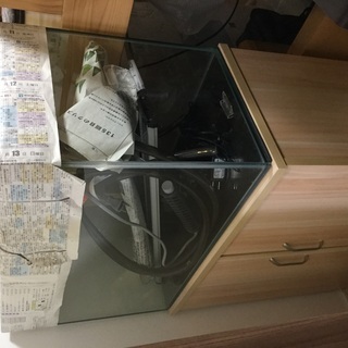 本格熱帯魚水槽セットです。水槽サイズ横60cm、高さ40cm、奥行き30cm。外部フィルター、サーモ、ライト2台、グッピーベビーボックス、熱帯魚の本、水槽台など。フィルターはありません。主にテトラのものです。取りに来られる方、よろしくお願いします。