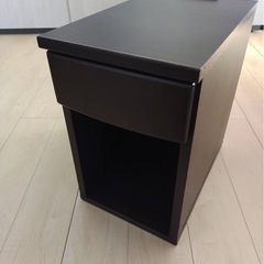 ダークブラウンの引き出し付きサイドテーブル、オープンシェルフで収納力抜群。ベッドサイドテーブル