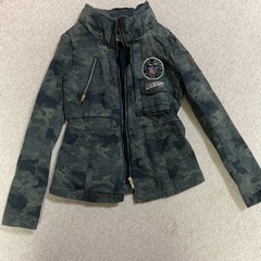 カモフラージュ柄ジャケットです。フード付きで、フードはジッパーでしまう事もできます。ジャケットとしては小さ目で、白Tシャツの上にそのままタイトな感じではおるとオシャレです。レディスサイズのS〜Mサイズです。小中学生のガールズが来てもハードな感じで可愛い。