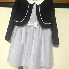 半袖の薄紫のワンピースに紺色のボレロのセットアップです。