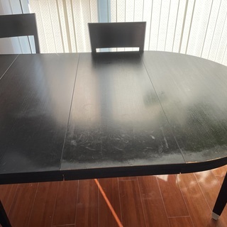 アメリカから個人輸入して使用したものです。10年使用しましたので使用感はありますが、使いやすいです。最小丸い1.2x1.2m、間にエクステンション46cmを最大3枚入れて2.6mx1.2mx高さ75cmになります。椅子は4脚 高さは50cmで革張りのクッションが付いています。