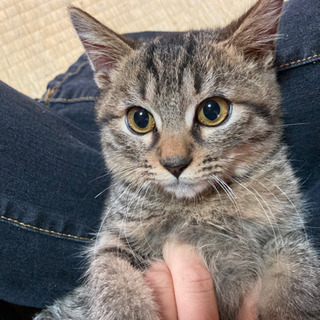 生後半年ほどのキジの男の子です。性格はマイペースで少しビビりですがずっと一緒だった黒猫の里親が見つかり、1人になったら甘えん坊になりました。去勢したばかりなのでおしりの毛が刈られています。