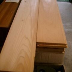 腰板や床などに貼るように加工された、ヒノキの木材です。 横で組み合わさる様に加工されています。3枚目の写真は裏側です。溝が付けて加工されています。部屋の腰板に使いました。ヒノキの香りがします。未使用ですが、中古品です。
