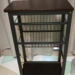 天板が木製の、 キッチンワゴンです。 天板と、一番下の棚が深い色の木製です。 脚やカゴの引き出しなどは深いグレーの金属製です。