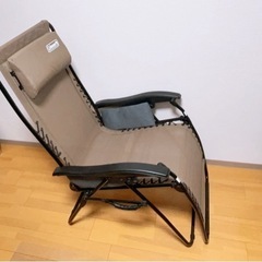 リクライニング機能付きのベージュポリエステル製アウトドアチェア。