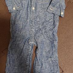 デニム地風のカバーオールでオムツ替えもしやすいように足は全開できるようになっています。目立った汚れもなく綺麗ですが、中古をご理解のかたに。