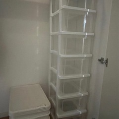 衣装ケースのまとめ売りです。引き出しキャビネットはキャスター無しで、幅30cm、奥行き38cm、深さ16cmが7段繋がっています。