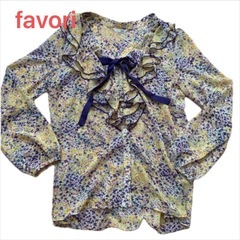 イエローとパープルを基調とした花柄のデザインで、胸元のフリルとリボンが可愛らしい印象です。これからの季節にぴったりの一枚です♥︎