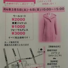R4年3月5日(土)、6日(日)10:00~15:00まで。有名百貨店にて販売されている婦人服を80%以上の割引価格で提供します。
