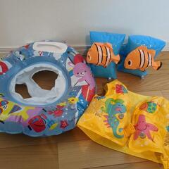 子供用の浮き輪と、腕につけるタイプの浮き輪と、着るタイプのものです。