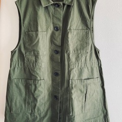 オリーブ色のフリーサイズベスト、前面に4つのポケット付き。ウエストしぼりあり