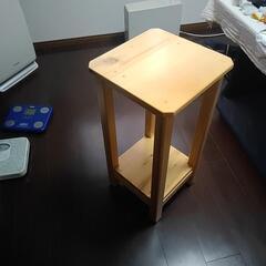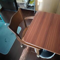 テーブルはプラスチックで60センチ四方、椅子の材質はケヤキです。