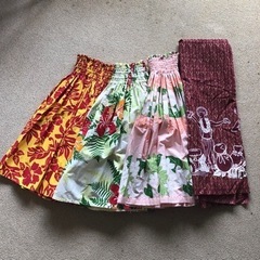 フラダンスで使うパウスカート3枚とフラダンス模様の生地です。