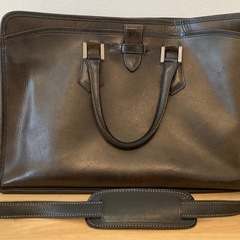 17年ほど前にアメ横の万双で購入した牛革のブリーフケースです。元々はネイビーですが、実物は現在焦茶に近いです。外ポケット:表と裏に一つずつ、サイドポケットなし、内ポケット:3箇所。ショルダーベルトは着脱可能。