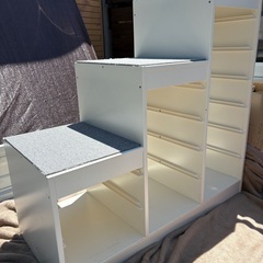 解体してウッドリサイクルに持ち込む予定でしたが、それも手間ですのでどなたかリサイクルできる方にお譲りします。収納ボックスも浅型6個、深型3個ついていますので、すぐに使えます。個人的にはいちどサンドペーパーかけて塗装するかラッピングするのが良い気がしますが...。