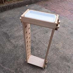 木製の台、カインズホームで木製のパーツを買い組み立てました。色んなパーツを組み合わせているのでしっかりしています。上のトレーは取り外し可能。
