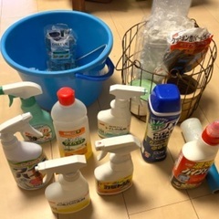 金たわし、リビング洗剤マイペット、部屋ピカ、パイプマン、カビとり泡スプレー、お風呂の洗剤、ワイドハイター、トイレの洗剤、漂白用パウダー、バケツ、スチールカゴ、ウエス(古布)、隙間用テープ、ガムテープ2つ、マスキングビニール、キッチンなど透明壁用シート、ラップの梱包材