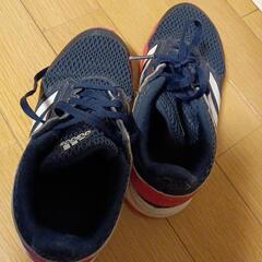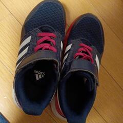 アディダスのスニーカーです。マジックテープタイプなので、小さなお子さんも履きやすいです。紺地に白とピンクのラインが入っていて、男女どちらでも使えると思います。名前の部分は黒く塗り潰してあります。