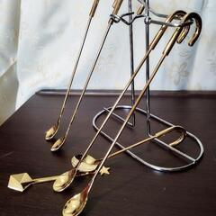 手ごたえある、キラキラ綺麗な金色ロングスプーン類です。