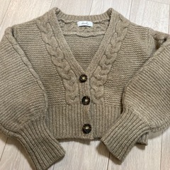 このニットカーディガンは、ケーブル編みのデザインが特徴で、シンプルながらも洗練された印象を与えます。バルーンスリーブが可愛らしさを引き立て、どんなコーディネートにもマッチします。