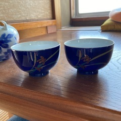 濃紺の湯呑み二客です。菖蒲の柄が付いており、優雅でスマートな感じです。汚れや傷みは目立ちません。
