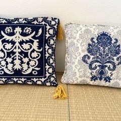 数年前に購入したクッションカバー2種です。中古ですが、目立つ汚れやほつれもなくきれいな状態です。カバーのみのお渡しになります。
